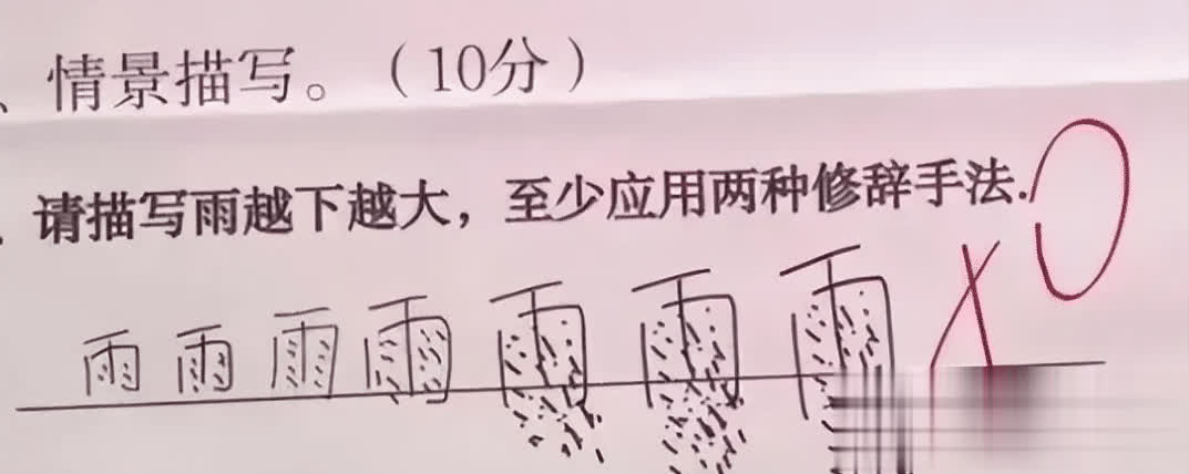 景况刻画题,可把孩子难坏了,请刻画雨越下越大,效果小学生灵机一动,用点的密集进度来暗示雨的大小,这脑回路亦然没谁了,气的讲授没话说。