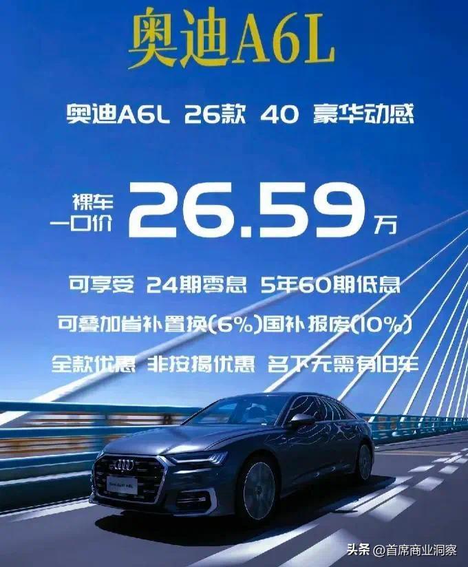 除此除外,奥迪的另还是典车型奥迪A6L,亦然降到了一个之前不敢念念的价钱。其携带价为42.79万的26款40豪华动感型,裸车一口价平直下探到26.59万。
