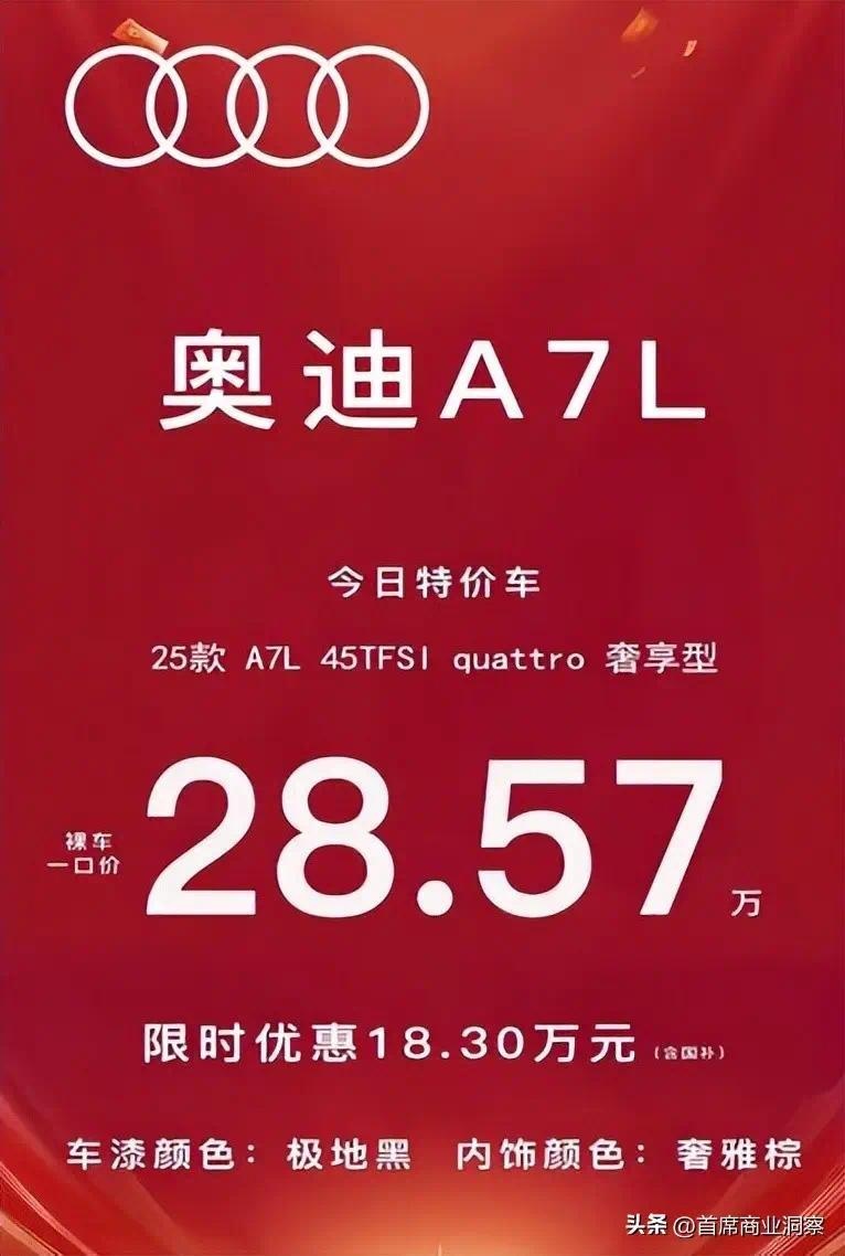 颜值相等在线的奥迪A7L,携带价为45.97万的25款A7L 45TFSI quattro 奢享型,在重叠国补等优惠之后,裸车价也平直下探到28.57万。