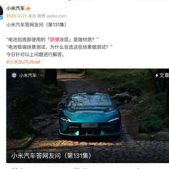 在之前的小米网友问答131期中,小米默示,电板底部的防弹涂层较传统电板包底部贯注材料,耐扯破性能擢升10倍、耐穿刺性能擢升13倍、耐刮擦性能擢升10倍、黏效能擢升10倍,或者充分的提高小米SU7 Ultra电板包的耐刮擦和耐穿刺性能。