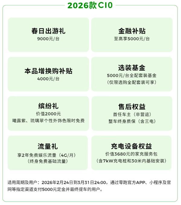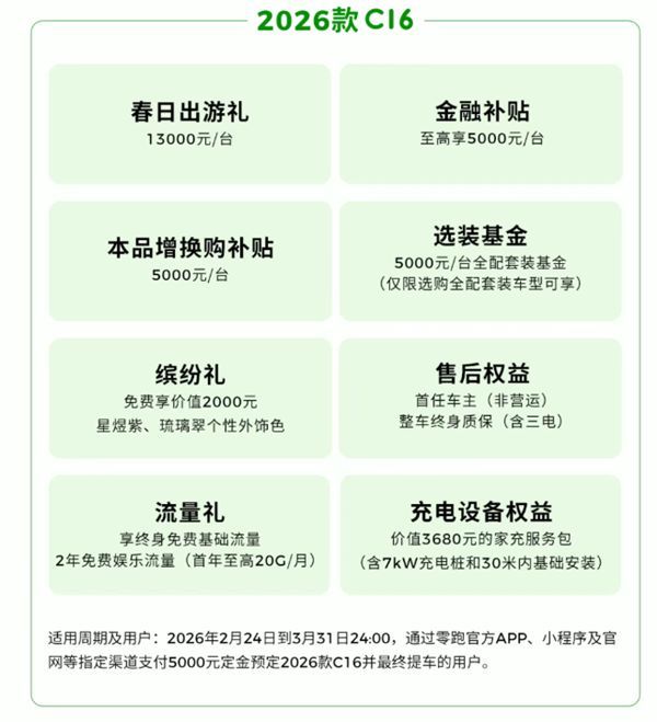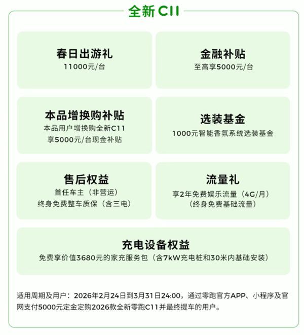 C11则送出价值3680元的家充管事包,并提供11000元出游礼与5000元增换购补贴,切实科罚充电暴躁;2026款C10则带来了9000元出游礼与5000元选装基金,并享整车终生质保。
