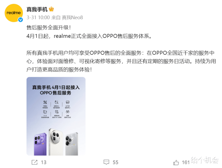 本年真我还有大行为,那便是精良了oppo旗下,全球挂牵的售后问题也科罚了,就在近期真我手机发博文称,从4月1日起realme真我认真全面接入oppo售后劳动体系,现时通盘真我手机齐不错享受oppo售后,能够体验维修、可视化寄修等劳动,之前许多东谈主买真我手机齐挂牵售后,现时就十足无谓麻烦,不错宽心起先真我手机了。