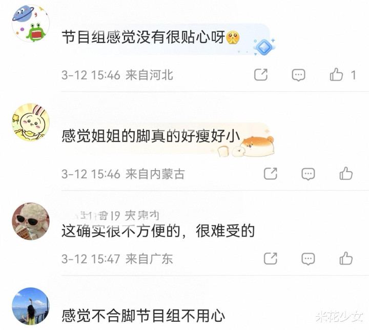 不少网友吐槽这期的节目组经费是很殷切吗?为什么要让杨蓉穿那么不对脚的高跟鞋。